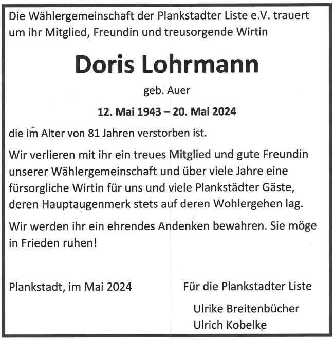 Die Plankstadter Liste trauert um ihr langj hriges Mitglied und Freundin Doris Lohrmann, die im Alter von 81 Jahren verstorben ist. F r die W hlergemeinschaft war sie viele Jahre die Wirtin schlechthin, in deren Lokalen Feldwanz, Ochsenhorn und Hundesport-Vereinsheim die PlaLi ihren Versammlungsort hatte und bei der sie sich immer gut aufgehoben und umsorgt f hlte.