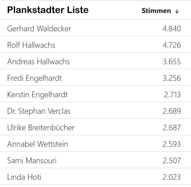 Stimmen der gew hlten Kandidaten der Plankstadter Liste